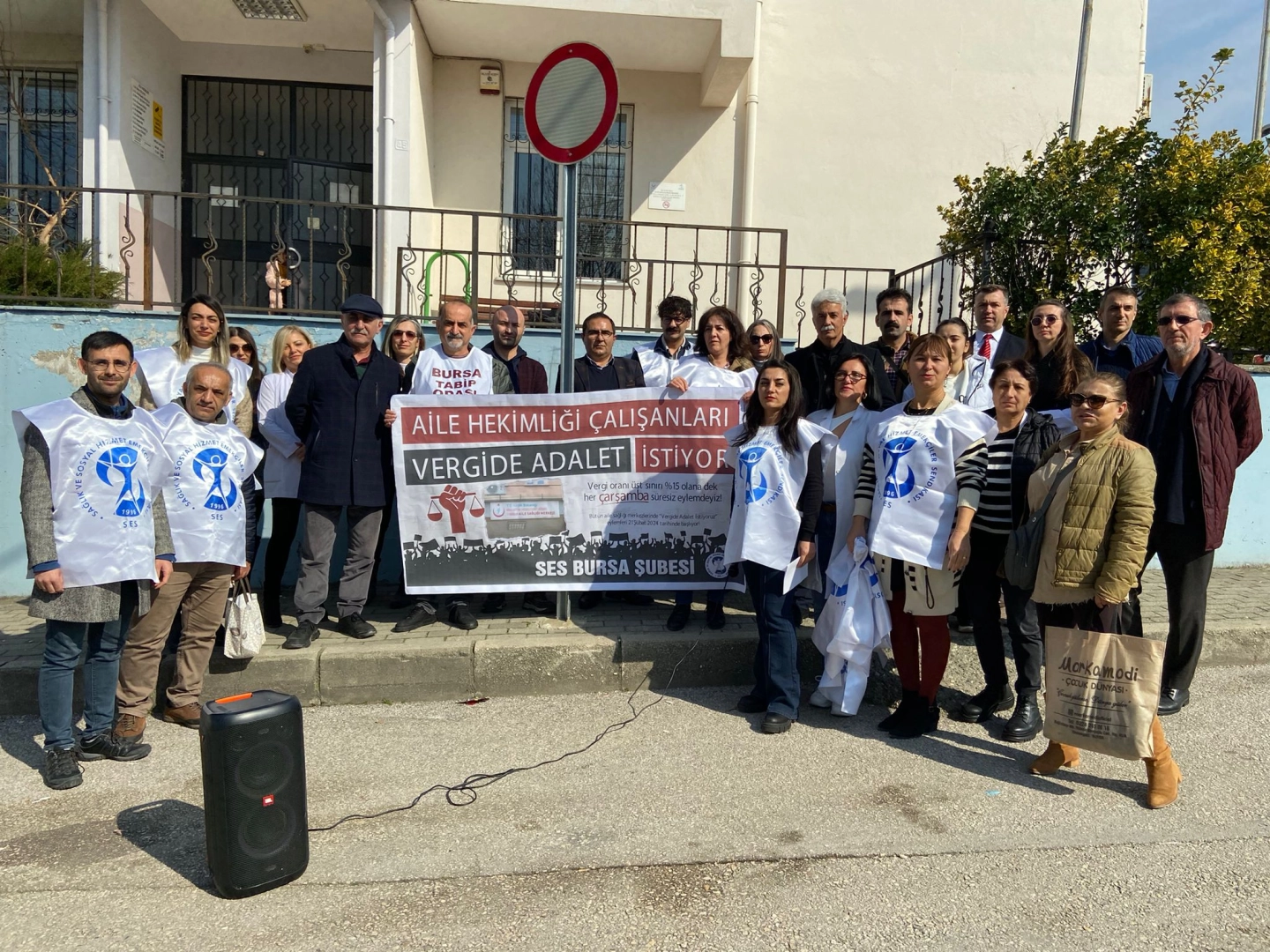 Bağlarbaşı Aile Sağlığı Merkezi önünde düzenlenen basın açıklamasında konuşan SES Bursa Şubesi Eş Başkanı Huriye Melek Türk, Aile Sağlığı Merkezlerinde sözleşmeli ve ücretli çalışan tüm emekçilerden alınan verginin artık dayanılmaz hale geldiğini, giderek kronikleşen enflasyon karşısında yetersiz kalan ücretlere ek olarak ASM çalışanlarından yılın ikinci yarısından itibaren yaklaşık %35 oranında vergi kesintisi yapıldığını, ASM çalışanlarının satın alma gücünün giderek düştüğünü ve çalışanlar arasında haksız ve ölçüsüz bir durum yaratıldığını vurguladı.