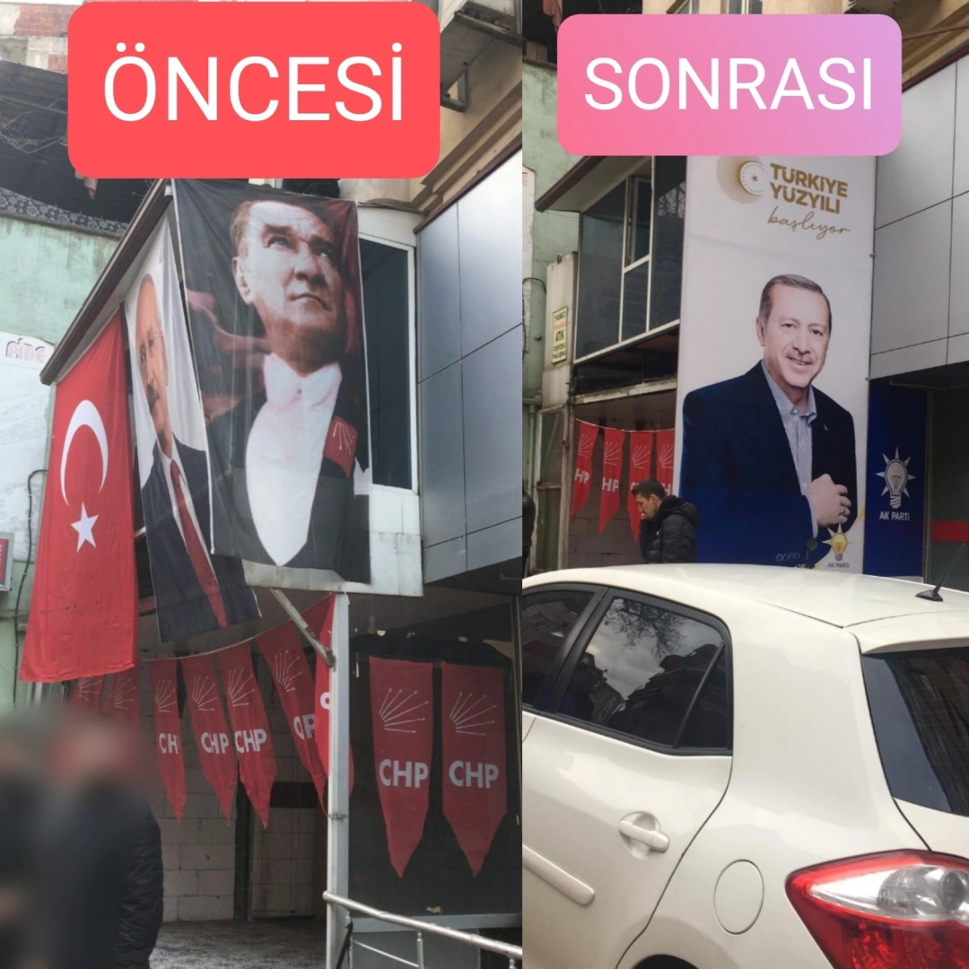 Önüne asılan afiş, Türk Bayrağı ve Atatürk posteri ile CHP Seçim Bürosu’nun önceki ve AKP’nin önünü kapattıktan sonraki fotoğraflarını paylaşan CHP Orhangazi İlçe Başkanı Vural Çetin şunları söyledi: