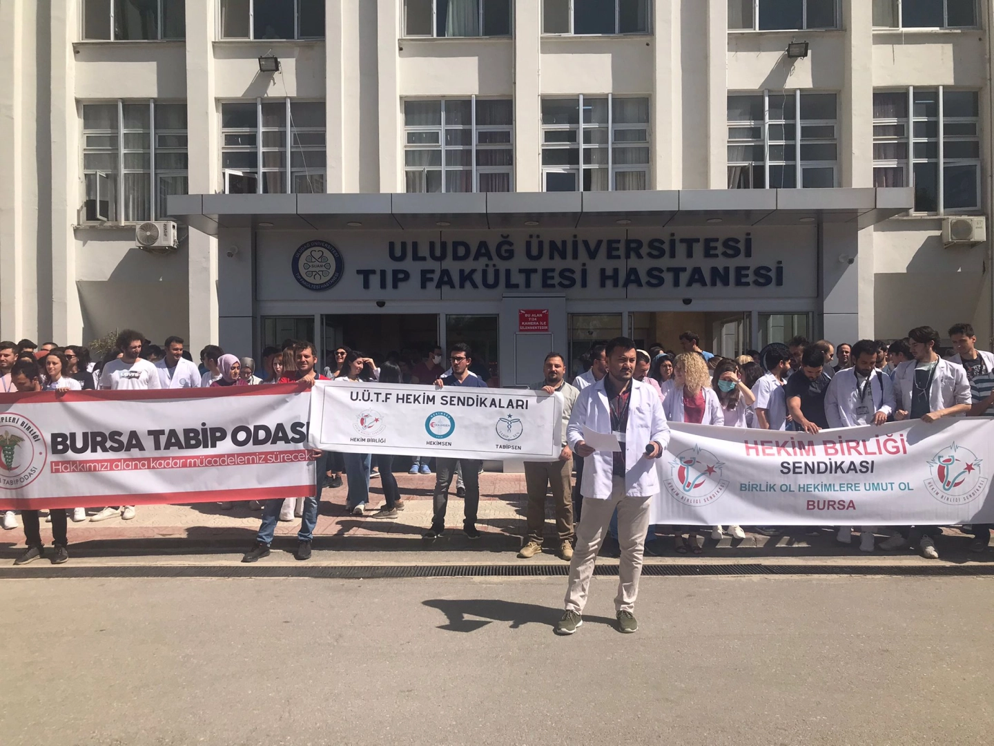 Uludağ Üniversitesi Hastanesi önünde toplanan asistan hekimler adına açıklamayı Emre Karaağaç okudu.
