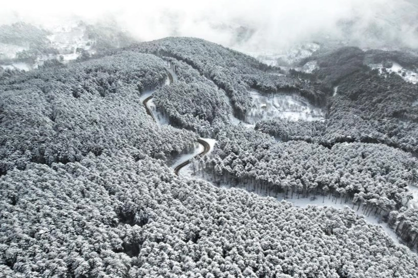 Kış mevsiminin etkisiyle beyaza bürünen ormanlık alanlar arasında ilerleyen yollar, havadan çekilen görüntülerde kartpostallık kareler oluşturdu.