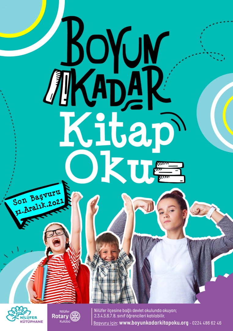 Okuma alışkanlığına destek olmak amacıyla Nilüfer Belediyesi ve Nilüfer Rotary Kulübü iş birliğiyle gerçekleştirilen projenin başvuruları 31 Aralık 2021 tarihinde sona erecek.Projede yer almak isteyen öğrencilerin www.boyunkadarkitapoku.org adresini ziyaret ederek başvuru formunu doldurmaları gerekiyor. Başvurusunu yapan öğrenciler dönem başından itibaren okudukları kitapların özetlerini “Özet yükle” ekranından yazabilecek . Özet yükleme 16 Mayıs 2022 Pazartesi günü sona erecek.