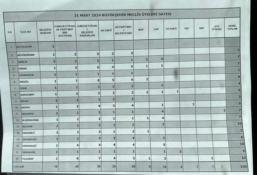 Bursa Büyükşehir Belediye Meclisi'nde 5 yıl boyunca görev yapacak 106 üyenin belediye başkanlıklarını kazanan partilere göre sayıları belli oldu. Buna göre Bursa'da 9 ilçenin belediye başkanlıklarını kazanan AKP ve Cumhur İttifakının Büyükşehir Belediyesi Meclis üye sayısı 59 olurken, Bursa Büyükşehir Belediyesi ve 6 ilçenin belediye başkanlıklarını kazanan CHP ile mecliste muhalefet konumuna düşen partilerin meclis üye sayısı 47 oldu.