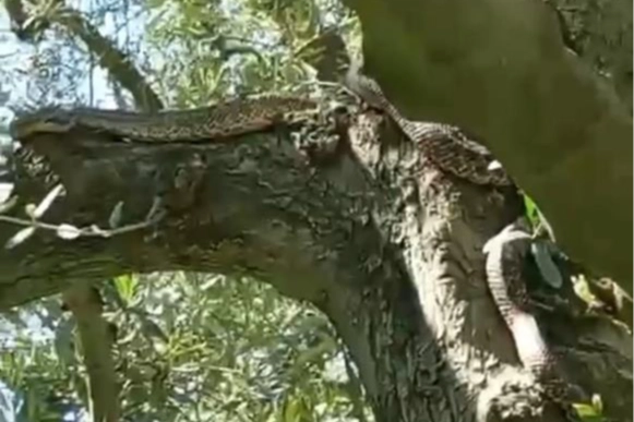 Bursa'nın İznik ilçesinde zeytin ağacının üstünde görülen 2,5 metre uzunluğundaki yılan cep telefonu kamerasına yansıdı. İznik ilçesinin Hisardere Mahallesinde 2,5 metrelik yılan, zeytin ağacına tırmandı. Tarlaya çalışmak için gelenler ağaçtaki yılanı görünce gözlerine inanamadı. Cüssesiyle insanın içini ürperten yılan, çalışanlarca cep telefonu ile kayda alındı. Dalların arasında ilerleyen yılan daha sonra gözden kayboldu.