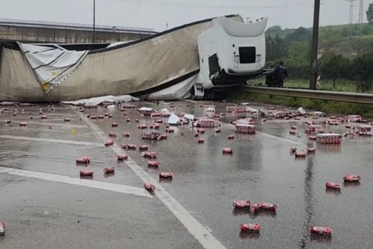 Bursa istikametine seyir halinde olan H.B idaresindeki tır, yağış etkisiyle kayganlaşan yolda sürücünün kontrolünden çıkarak önce bariyere çarptı ardından yola devrildi.