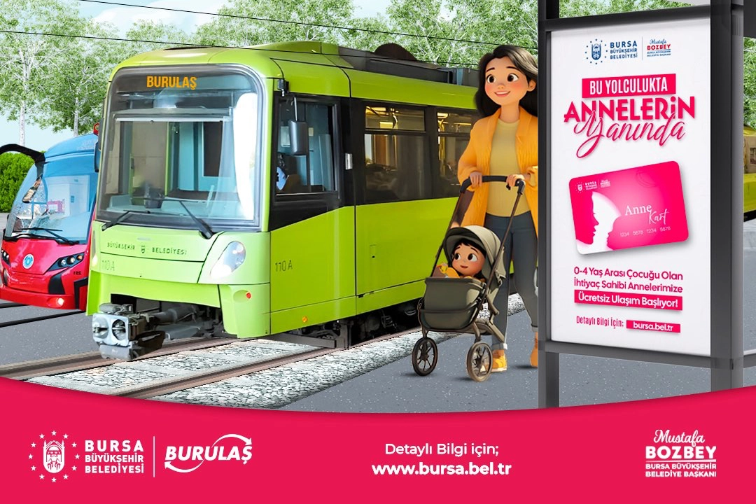 "Bursa Büyükşehir Belediyesi olarak, kentimizdeki annelere yönelik sosyal destek projelerimize bir yenisini daha ekliyor; 0-4 yaş arası çocuğu olan ihtiyaç sahibi annelere, AnneKart uygulamamız ile BursaRay ve T1, T2, T3 tramvay hatlarımızda ücretsiz ulaşım olanağı sağlıyoruz."