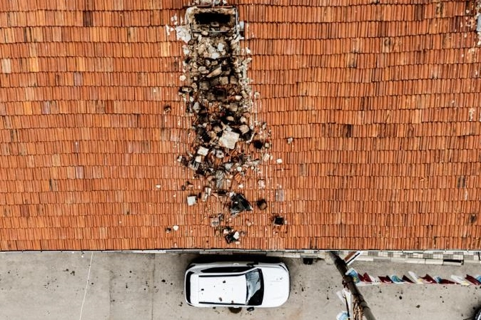 Edinilen bilgiye göre olay Keles ilçe merkezinde yaşandı. İddiaya göre yol üzerindeki 3 katlı bir binanın çatısındaki çürüyen baca gürültü ile devrildi. Bacadan kopan beton ve tuğla parçalar evin önünde yol üzerinde park halinde bulunan 16 BZP 165 plakalı otomobilin üzerine düştü. Şans eseri yolun boş oluşu facianın önüne geçti.