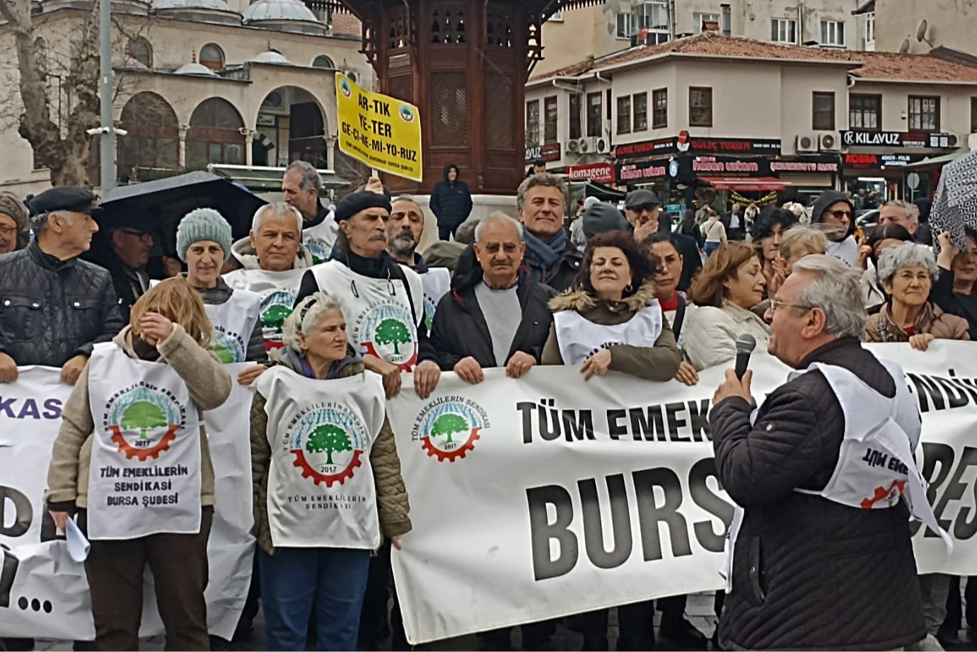 Tüm Emeklilerin Sendikası'nın çağrısıyla Setbaşında bir araya gelen emekliler bildiri dağıtarak Fomara Meydanı'na yürüdü. Burada basın açılaması yapan emeklilere CHP Bursa Milletvekili Orhan Sarıbal'da destek verdi.