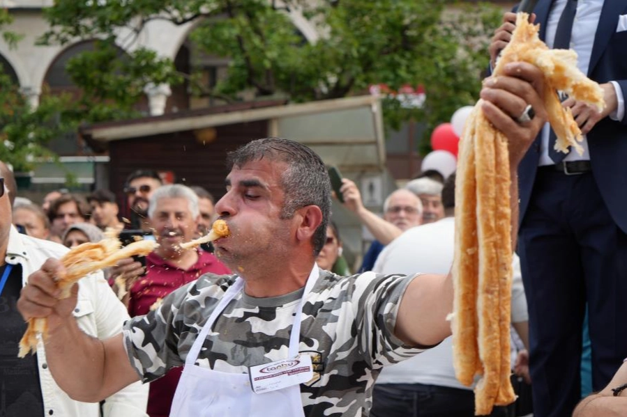 14. Geleneksel Börek Yeme Yarışması bu yıl Bursa'daki 15 Temmuz Demokrasi Meydanı'nda yapıldı. Yarışmaya katılan onlarca kişi, belirlenen 5.5 dakika sürede en fazla böreği yemek için kıyasıya mücadele etti. 35 derece sıcakta ağızlıklarına tıktıkları börekleri yutabilmek için adeta savaş veren yarışmacılar sıcağın altında ecel terleri döktü. Zaman zaman baygınlık seviyesine gelen yarışmacılar başlarından aşağı su döküp börek yemeğe devam ettiler. Meraklı vatandaşların tezahüratlarıyla daha da gaza gelen bazı yarışmacılar ellerine aldıkları böreklerle masanın üzerine çıkıp şov yaptı. Renkli görüntülere sahne olan börek yeme yarışmasında birinci ikinci ve üçüncü olan yarışmacılar aynı uzunlukta 11'er metre börek yiyince devreye hassas terazi girdi. Yarışmacıların yemeden geride bıraktığı börek parçaları ile kırıklar hassas terazi ile tartılarak yarışmanın birincisi belirlendi. 584 gramla geride en az börek bırakan Ali Kılıç birinciliği kazanıp 10 gram altının sahibi olurken, 624 gram ile Fatma Arslan ikinci olup 5 bin lira, 700 gram ile Uğur Dündar ise üçüncü olup 2 bin 500 lira kazandı.