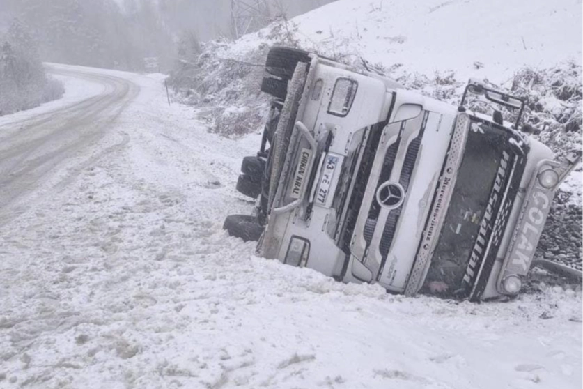 Bursa'nın İnegöl ilçesinde kar yağışı sebebiyle kayarak yoldan çıkan tır devrildi. Kazada 2 kişi yaralandı.