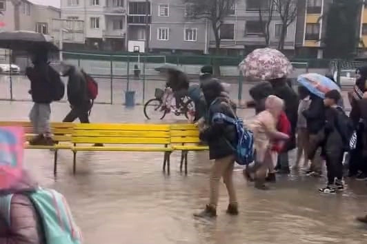 Olay Mahmudiye Mahallesi'nde eğitim öğretime devam eden Müşerref Muzaffer Samda İlkokulu bahçesinde meydana geldi. Yoğun yağış nedeniyle okulun bahçesi göle döndü. Veliler öğrencileri okuldan çıkarmak için bankları sıralayıp geçirdiler.