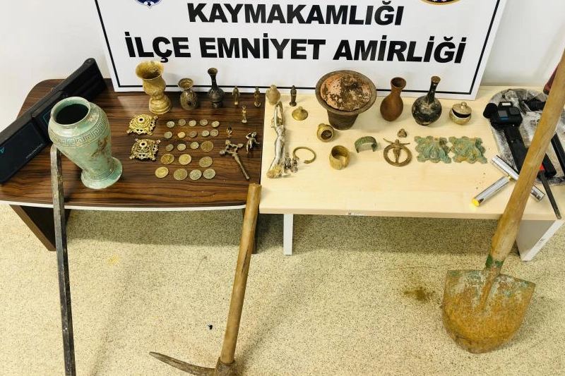 Bursa Orhaneli ilçesi Kurtoğlu bölgesinde izinsiz kazı yaparak tarihi eser kaçıran üç şüphelye ilgili bilgi edinen Orhaneli İlçe Emniyet Müdürlüğü ekipleri, gelen ihbarın ardından hızlı bir şekilde harekete geçti. Cumhuriyet Başsavcılığı'ndan gerekli izni alan polis ekipleri, tarihi eser kaçakçılarını düzenlenen baskınla suçüstü yakaladı. Şüphelilerin üzerinde kazılarda kullanılan dedektör, kazma, kürek, levye, kamera ve alan tarama cihazları bulundu. Bölgede yapılan aramada, tarihi eser niteliği taşıdığı değerlendirilen sikkeler, heykeller ve yaklaşık 50 farklı eser tespit edildi. Eserlerin tamamına el konulurken, gözaltına alınan üç şüpheli ifadeleri alınmak üzere adliyeye sevk edilecek.