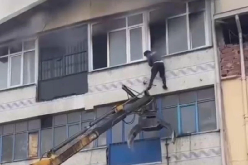 Bursa'nın Yıldırım ilçesi Duaçınar, Karlıdağ Caddesi üzerinde bir tekstil üreticisi olarak faaliyet gösteren iş yerinde yangın çıktı. Alevlerin sardığı binada mahsur kalan bir vatandaş ise kendisini camdan sarkıttı. Bu esnada vatandaşın atlamak üzere olduğunu fark eden vinç operatörü hemen binaya yaklaşıp mahsur kalan vatandaşa uzandı. Vince binen vatandaş, mahsur kaldığı alandan, güvenli yere indirilirken, ihbar üzerine olay yerine gelen itfaiye ekipleri, alevlere müdahale etti. Yangına kısa sürede müdehale eden ekipler, alevlerin başka binalara sıçramasını önledi. Dumandan etkilenen 4 kişi ise sağlık ekiplerince ilk müdahalesinin ardından hastaneye sevk edildi. Yangının çıkış nedeni araştırılıyor.