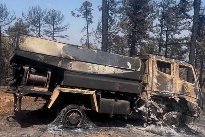 Bursa'nın Harmancık ilçesindeki orman yangınında Orman Genel Müdürlüğü'ne ait bir kamyon alevlerin arasında kalarak küle döndü. Ekipler, yangın bölgesinden son anda kaçarak canlarını zor kurtardı.