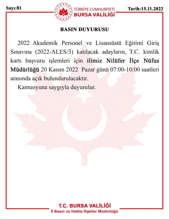 Bursa Valiliği'nden yapılan açıklama şu şekilde; "2022 Akademik Personel ve Lisansüstü Eğitimi Giriş Sınavına (2022-ALES/3) katılacak adayların, T.C. kimlik kartı başvuru işlemleri için ilimiz Nilüfer İlçe Nüfus Müdürlüğü 20 Kasım 2022 Pazar günü 07:00-10:00 saatleri arasında açık bulundurulacaktır. Kamuoyuna saygıyla duyurulur."