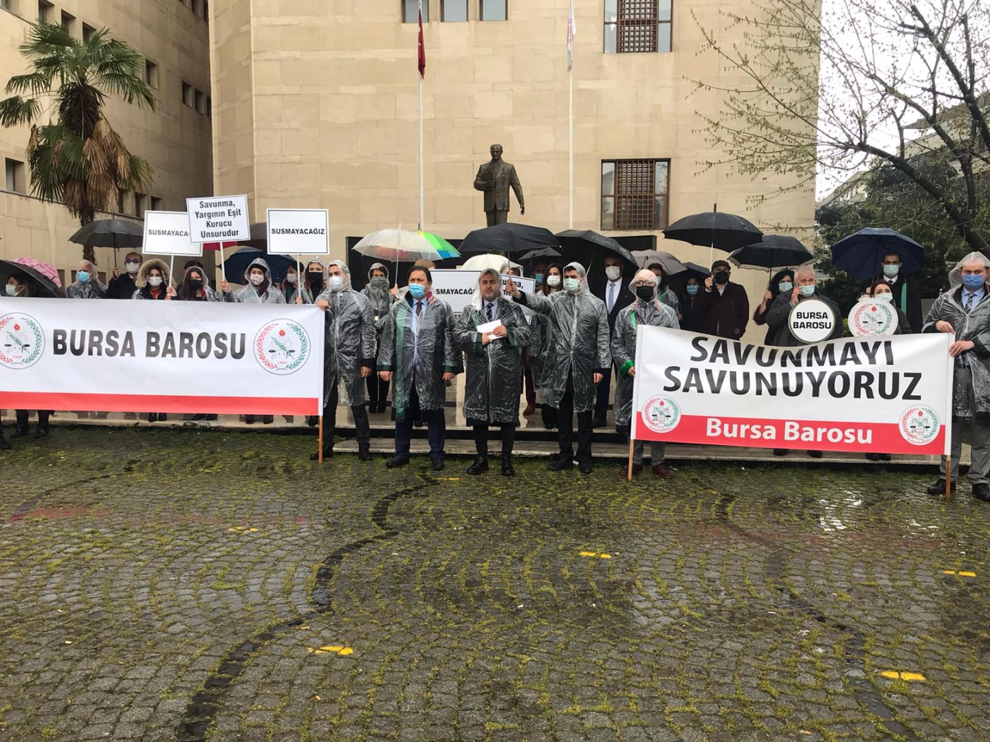 Bursa Barosu Başkanı Avukat Gürkan Altun, yönetim kurulu üyeleri ve avukatlar, 5 Nisan nedeniyle şiddetli yağışa rağmen Adalet Sarayı bahçesi Atatürk Anıtı önünde buluştu. Bursa Adalet Sarayı bahçesinde yapılan basın açıklamasında, Avukatlar Günü’nün neden kutlanmadığı ve kutlanamadığı açıklandı.