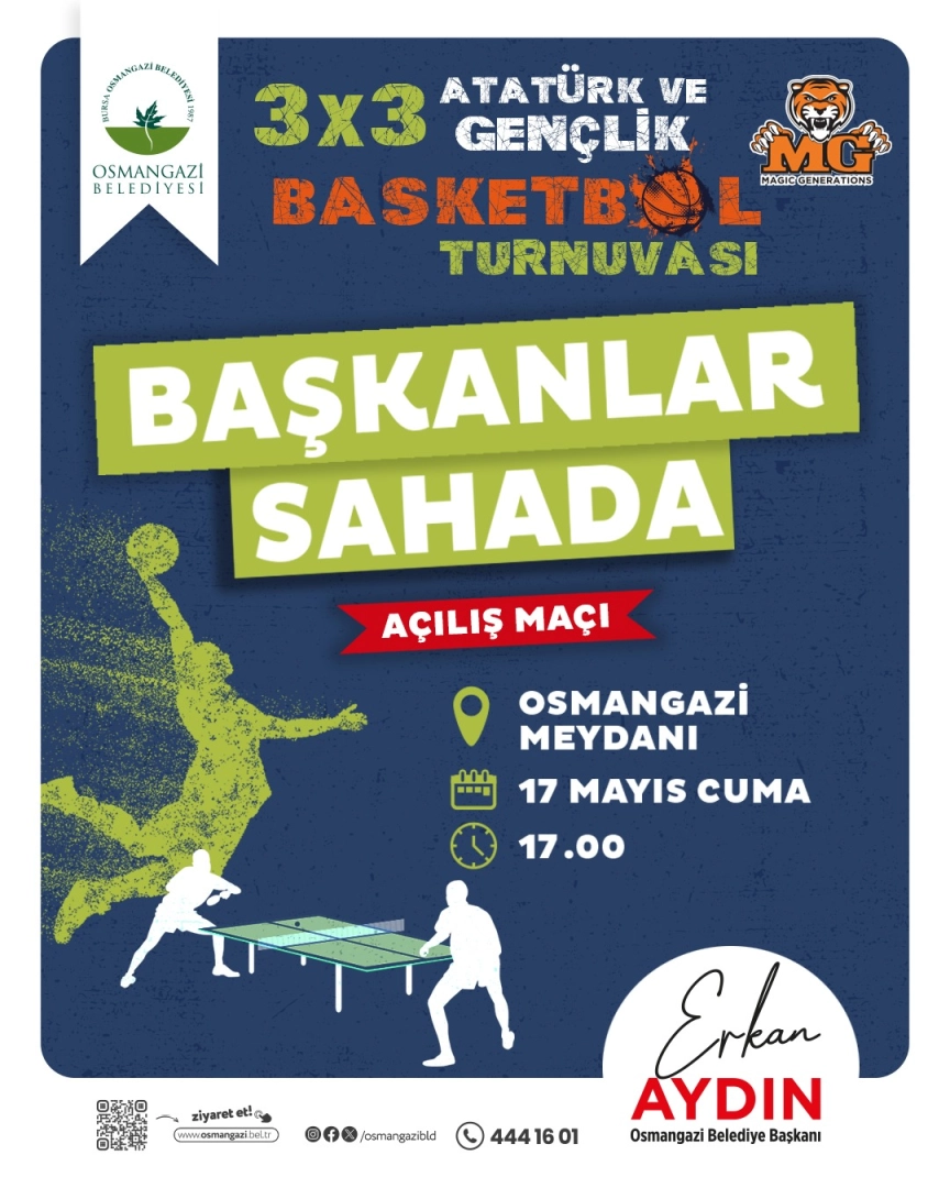 19 Mayıs Atatürk'ü Anma, Gençlik ve Spor Bayramı dolayısıyla Osmangazi Belediyesi tarafından düzenlenen 1. Osmangazi Gençlik ve Spor Şöleni kapsamında Osmangazi Meydanı'nda gerçekleştirilecek "3x3 Atatürk ve Gençlik Sokak Basketbolu Turnuvası" gösteri maçında Belediye Başkanları ve gençler karşılaşacak.