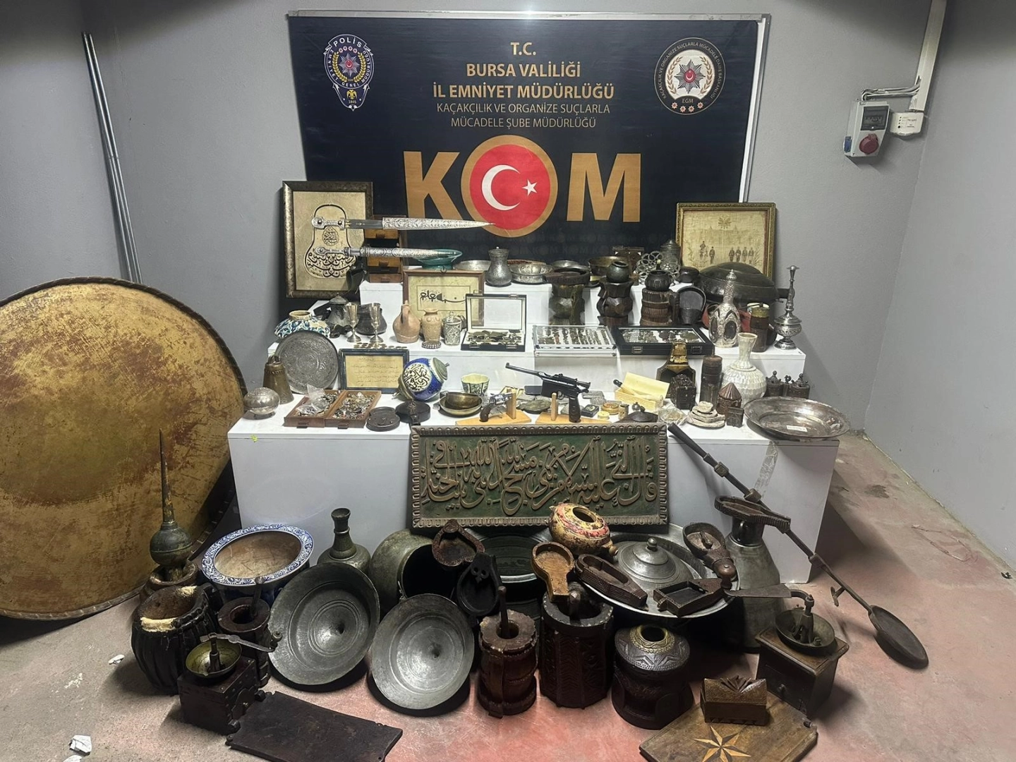 Bursa Kaçakçılık ve Organize Suçlarla Mücadele Şube Müdürlüğü merkez Nilüfer ilçesindeki bir adrese gerçekleştirdiği operasyonda çok sayıda tarihi eser ele geçirdi.