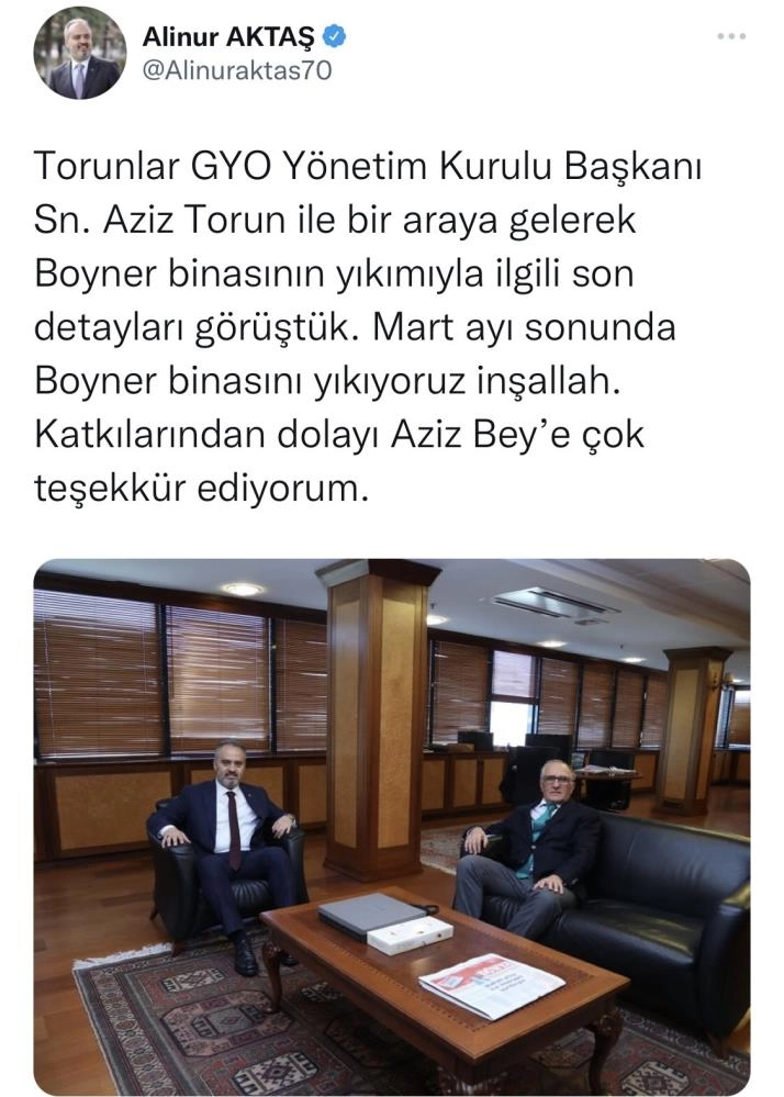 Aktaş’ın yaptığı paylaşımda, “ Torunlar GYO Yönetim Kurulu Başkanı Aziz Torun ile bir araya gelerek Boyner binasının yıkımıyla ilgili son detayları görüştük. Mart ayı sonunda Boyner binasını yıkıyoruz inşallah. Katkılarından dolayı Aziz Bey’e çok teşekkür ediyorum” ifadelerine yer verdi.