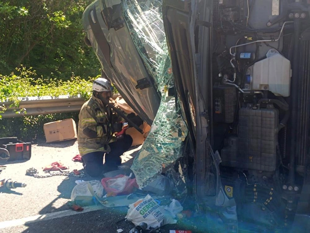 Bursa'nın İnegöl ilçesi Mezit boğazında meydana gelen kazada devrilen tırın sürücüsü hayatını kaybetti.