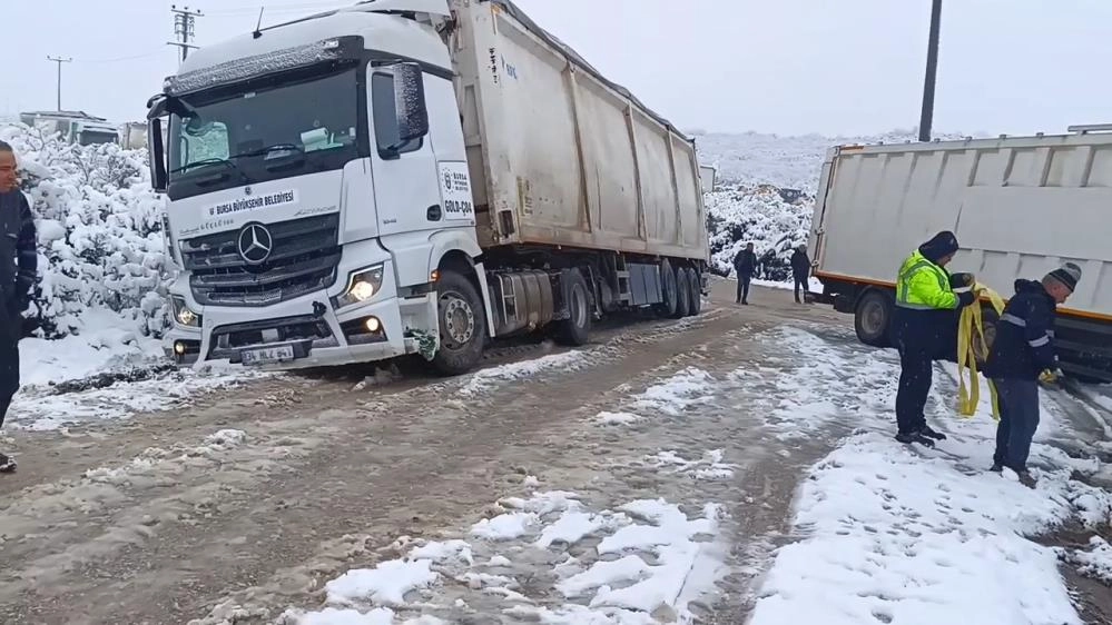 Bursa'da yağan kar sonrası tırlar yolda kaldı. O anlar vatandaş kamerasına yansıdı.