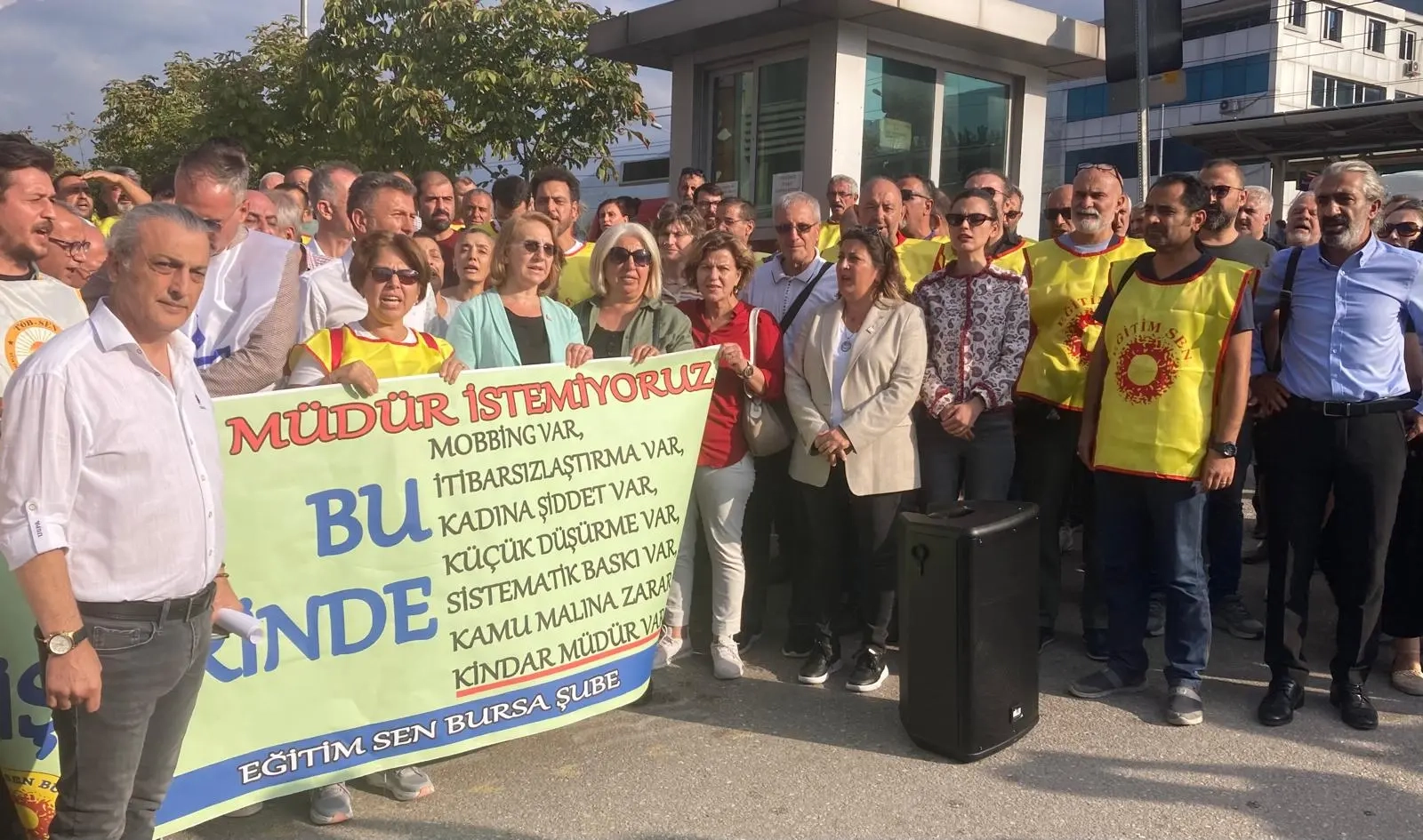 Eğitim Sen Bursa Şubesi, Mahmut Celalettin Öktem İmam Hatip Ortaokulu müdürü Ergin Kaya Kırbıyık’ınüyelerine yaptığı mobbing ve odasının kapısını kırması üzerine okul önünde açıklama yaptı.