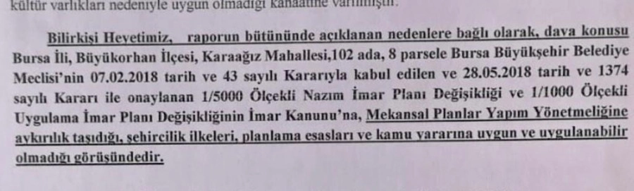 "Bilirkişi heyetimiz, raporun bütününde açıklanan nedenlere bağlı olarak, dava konusu Bursa ili, Büyükorhan ilçesi, Karaağız Mahallesi, 102 ada, 8 parsele Bursa Büyükşehir Belediye Meclisi'nin 7 Şubat 2018 tarih ve 43 sayılı kararıyla kabul edilen ve 28 Matıs 2018 tarih ve 1374 sayılı kararı ile onaylanan 1/5000 ölçekli Nazım İmar Planı Değişikliği ve 1/1000 ölçekli Uygulama İmar Planı Değişikliğinin İmar Kanunu'na, Mekansal Planlar Yapım Yönetmeliğine aykırılık taşıdğı, şehircilik ilkelerİ, planlama esasları ve kamu yararına uygun ve uygulanabilir olmadığı görüşündedir."