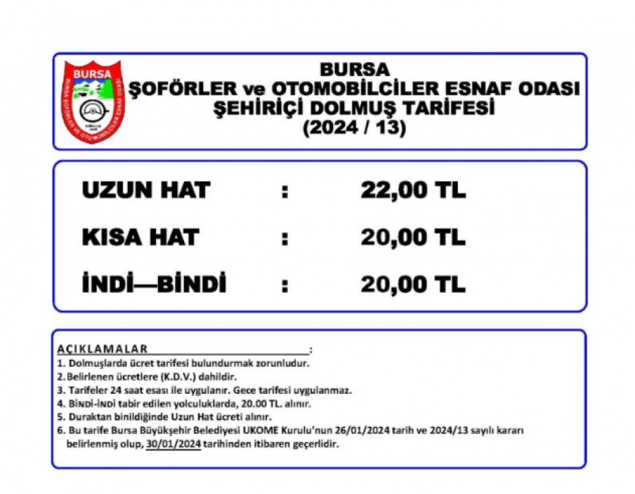 Bursa'da şehir genelinde bir çok noktada kullanılan taksi dolmuş fiyatlarına zam geldi.