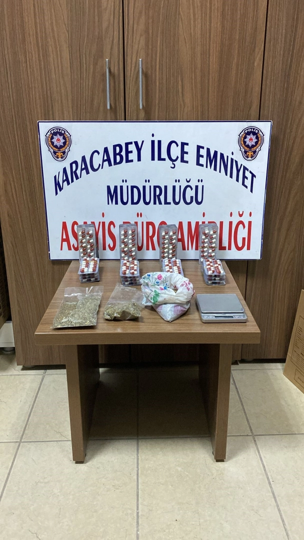 Karacabey İlçe Emniyet Müdürlüğü Asayiş Büro Amirliği ekipleri, ilçede uyuşturucu ticareti yapan ve uyuşturucu madde kullandığı belirlenen 28 kişiyi takibe aldı. Polis ekiplerinin yaptığı teknik ve fizikî takip sonucunda şüphelilerin araçlarında ve ikametlerinde arama yapıldı. Aramalarda 448 adet Uyuşturucu Hap, 207.48 gram sentetik kannabinoid (bonzai), 322 gram methamfetaminin (met), 5.79 gram esrar, 1 adet hassas terazi, 4 tabanca ve 1 pompalı tüfek ele geçirildi.