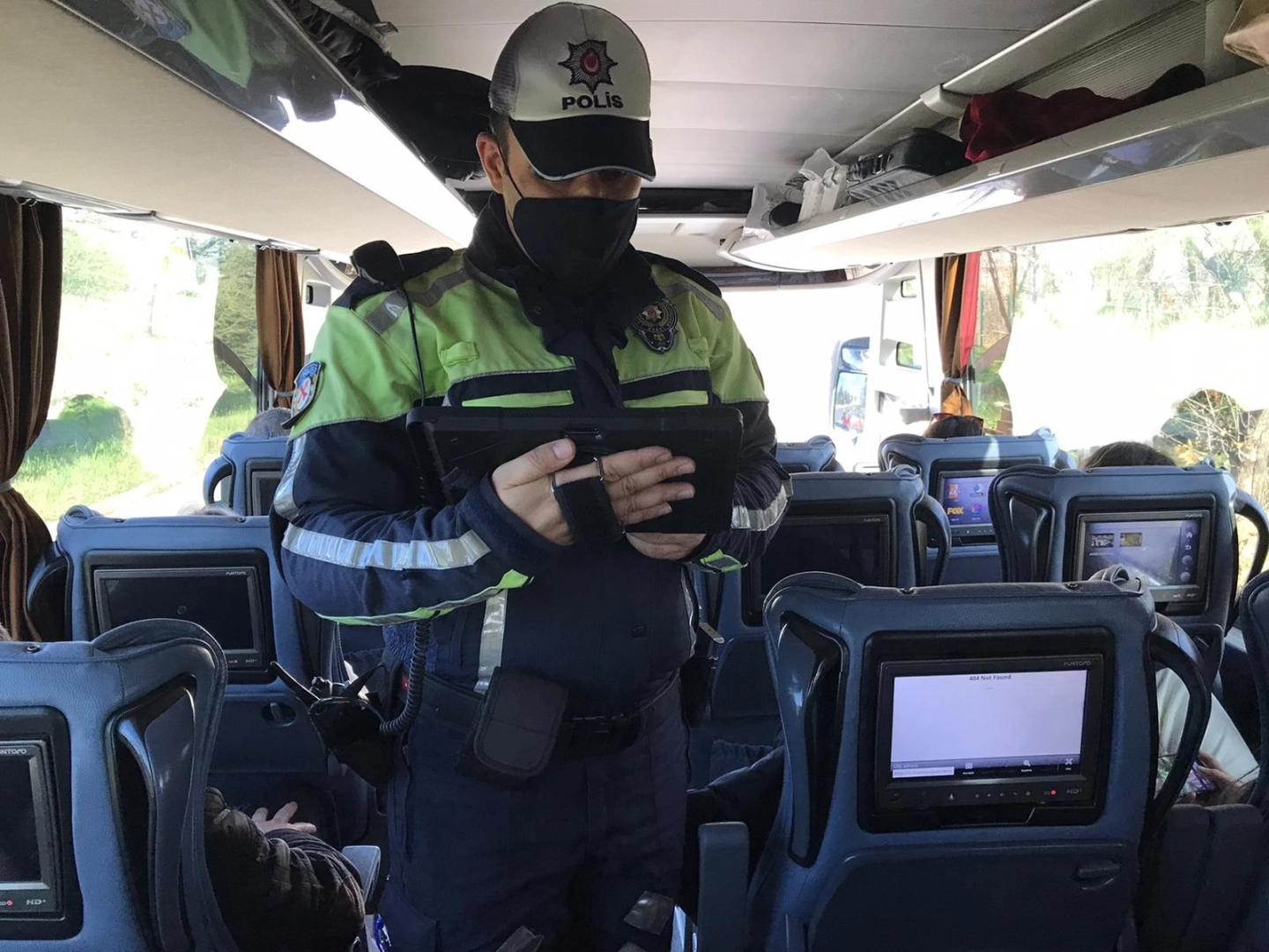 Bursa'da trafik ekipleri yılbaşı öncesi yoğunluğun yaşandığı Şehirlerarası Otobüs Terminali'nde yolculara HES kodu ve araçlara kış lastiği denetimi yaptı.
