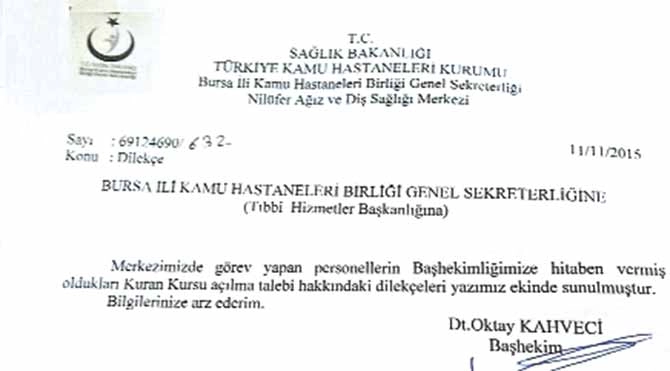 Bursa Nilüfer Ağız ve Diş Sağlığı Merkezi'nde iki diş hekimi ve iki görevli memur 4 ayrı dilekçe vererek hastane içerisinde Kuran kursu açılması için başhekimliğe başvuru yaptı. Sözcü'den