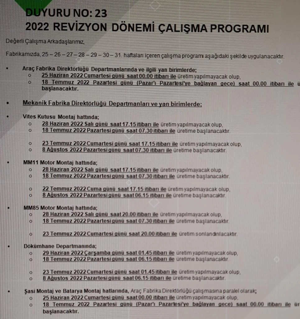 Bursa’daki otomotiv devi Oyak Renault, üretim planlamasında değişiklik yaptı. Fabrika tarafından yapılan bilgilendirmede, araç fabrika direktörlüğü departmanlarında ve ilgili yan birimlerde; 25 Haziran-18 Temmuz tarihleri arası üretim yapılmayacağı duyuruldu.