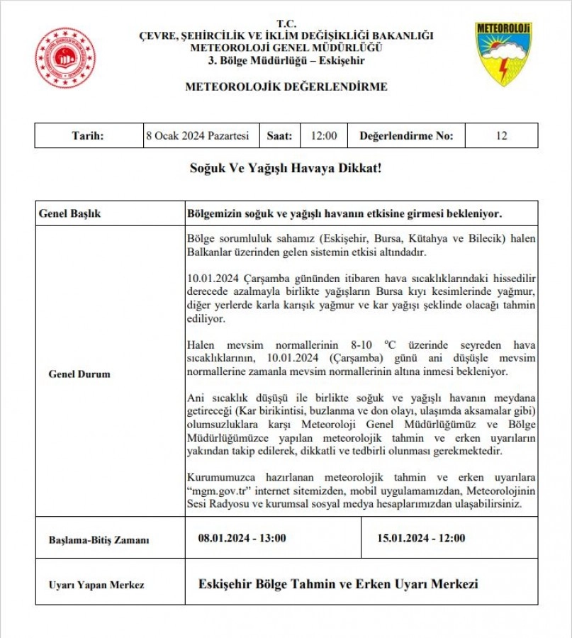 Bölge sorumluluk sahamız (Eskişehir, Bursa, Kütahya ve Bilecik) halen Balkanlar üzerinden gelen sistemin etkisi altındadır.10.01.2024 Çarşamba gününden itibaren hava sıcaklıklarındaki hissedilir derecede azalmayla birlikte yağışların Bursa kıyı kesimlerinde yağmur, diğer yerlerde karla karışık yağmur ve kar yağışı şeklinde olacağı tahmin ediliyor.