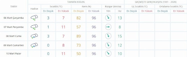 Meteoroloji'nin yayımladığı 5 günlük ilçe hava durumu raporları şöyle: