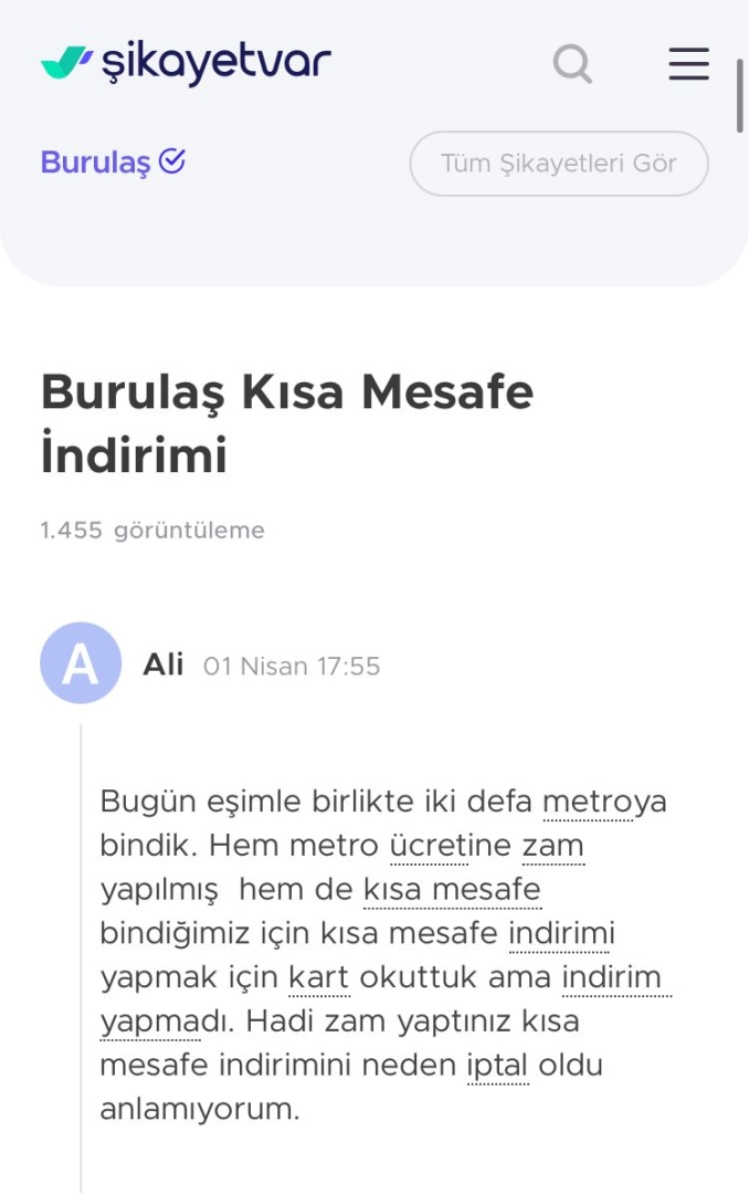 Kısa mesafe para iade uygulamasının kaldırılması yurttaşlar taradından tepkilere sebep oldu. Bazı yurttaşlar rahatsızlıklarını online şikayet siteleri üzerinden duyurmaya çalıştı. Kısa mesafe ücret iadesi uygulamasının kaldırıldığını teyit eden Burulaş personeli bu uygulamanın neden ve ne zaman kaldırıldığına dair ise bilgi vermedi.