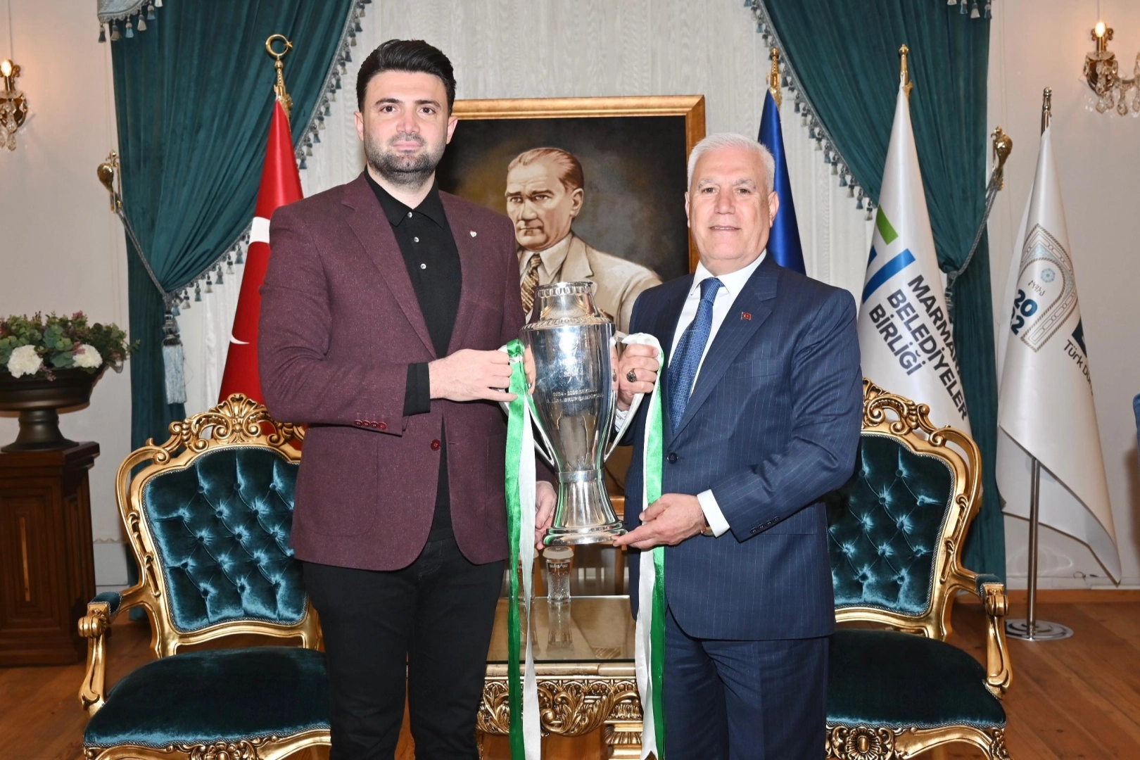 Nesine 3. Lig 1. Grup'ta şampiyonluğa ulaşarak 2. Lig'e yükselmeye hak kazanan Bursaspor’un Başkanı Enes Çelik ve yönetim kurulu üyeleri, şampiyonluk kupasıyla birlikte Bursa Büyükşehir Belediye Başkanı Mustafa Bozbey’i Tarihi Belediye Binası’nda ziyaret eti. Samimi bir ortamda gerçekleşen ziyarette, zorlu bir süreçten geçerek bir üst lige çıkmayı başaran Bursaspor’un yeni hedefleri konuşuldu.