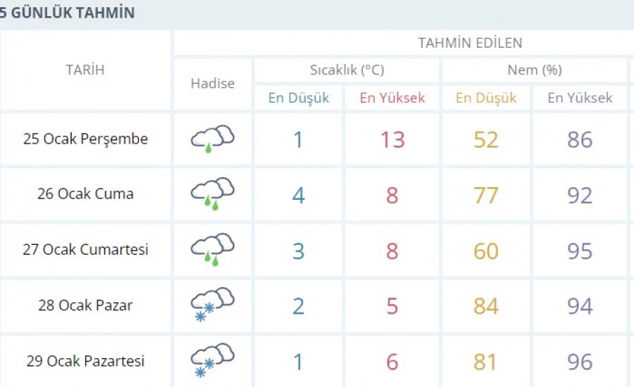 Bursa'nın beş günlük hava durumu şöyle;