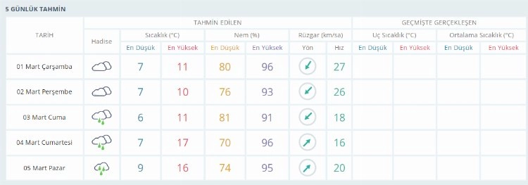 Haftanın son iş gününde cuma sabah saatlerinde hava sıcaklığı 7 derece seviyelerinde seyrederken gün içerisinde çok bulutlu gökyüzü ve yer yer yağış geçişleriyle birlikte termometreler en yüksek 16 dereceyi ölçecek. Cumartesi günü yer yer etkili olan sağanak yağış geçişleri ve çok bulutlu gökyüzüyle birlikte termometreler en yüksek 18 dereceyi gösterecek.