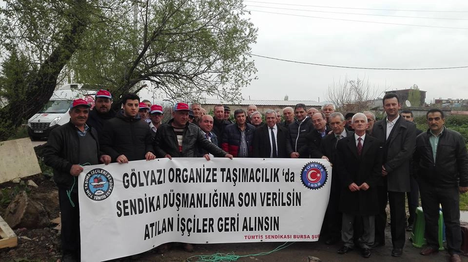 CHP İstanbul Milletvekili Aykut Erdoğdu, CHP Bursa İl Başkanı Şadi Özdemir ve İl örgütü üyeleri, sendika üyesi olduğu gerekçesiyle işten çıkarılan TÜMTİS üyesi işçilerinin eylemine destek oldular. CHP İstanbul Milletvekili Aykut Erdoğdu, CHP Bursa İl Başkanı Şadi Özdemir ve İl örgütü üyeleri, sendika üyesi olduğu gerekçesiyle Gölyazı Organize Taşımacılık Şirketi’nin işten çıkardığı TÜMTİS üyesi işçilerin eylemine destek oldular. İşveren şirket ve işçilerin yaşadıkları sıkıntılar hakkında bilgi veren TÜMTİS Şube Başkanı Özdemir Arslan Gölyazı Organize Taşımacılık Şirketi’nin şehirlerarası yük ve nakliye taşıyan bir şirket olduğunu ve 2015 yılı Aralık ayı itibariyle toplam 22 kişinin sigortalı olduğunu ancak fiziki olarak 10 işçinin çalıştığını ifade etti. İşçilerin çalışma saatlerinin çok ağır olduğunu belirten Arslan; “Sabah 08.00’da iş başı yapan işçiler gece en erken 23.00 olmak üzere, işleri kaçta biterse işi sonlandırıp, ertesi gün sabah 08.00’da tekrar işbaşı yapıyorlar. Bu haftanın 6 günü bu şekilde oluyor. Anayasamızda haftada 45 saat çalışma var. İşçiler bu durumdan bıktıkları için bir araştırma içerisine girdiler. Sendikamız TÜMTİS’le buluştuktan sonra, biz kendilerine anayasal hak olan sendikalı olma haklarıyla ancak bu işin düzelebileceğini söyledik ve üye yapmaya başladık. İşveren 2015 son aylarında işçileri, sendikaya üye oldukları için baskı altına almaya çalıştı. 16 Şubat’ta emekçi arkadaşımız İsmail Saraç’ı arayarak, hiçbir hakkını vermeden işten çıkardılar” dedi.
