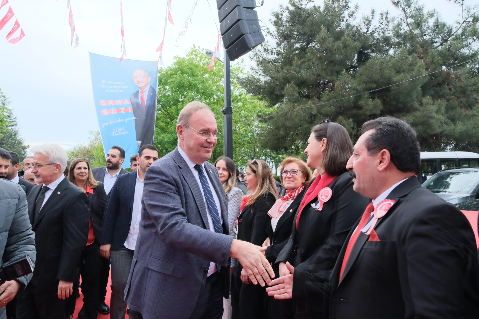 CHP Bursa Büyükşehir Belediyesi Başkan Adayı Mustafa Bozbey ise 14 Mayıs seçimlerinin demokraside bir yol ayrımı olduğunu vurgulayarak “Yeni binamız çok güzel olmuş. Ama 15 gün boyunca bu binada oturmayalım, gece gündüz evleri ziyaret edelim. Kadınları, gençleri ikna edelim. 15 gün sonra akşam saatlerinde de bu meydanda kutlama yapalım. Mevcut sistem devam ederse Ortadoğu ülkesi olacağız. Diğer yol ise demokrasinin, özgürlüğün, insan haklarının, adaletin, hakça paylaşımın yolu. İnsanlarımıza mutlaka bu yolu anlatmamız, bu yolda oy vermelerini sağlamamız gerekiyor. Nasıl bir ülkede yaşayacağımıza attığımız oylarla karar vereceğiz” dedi.