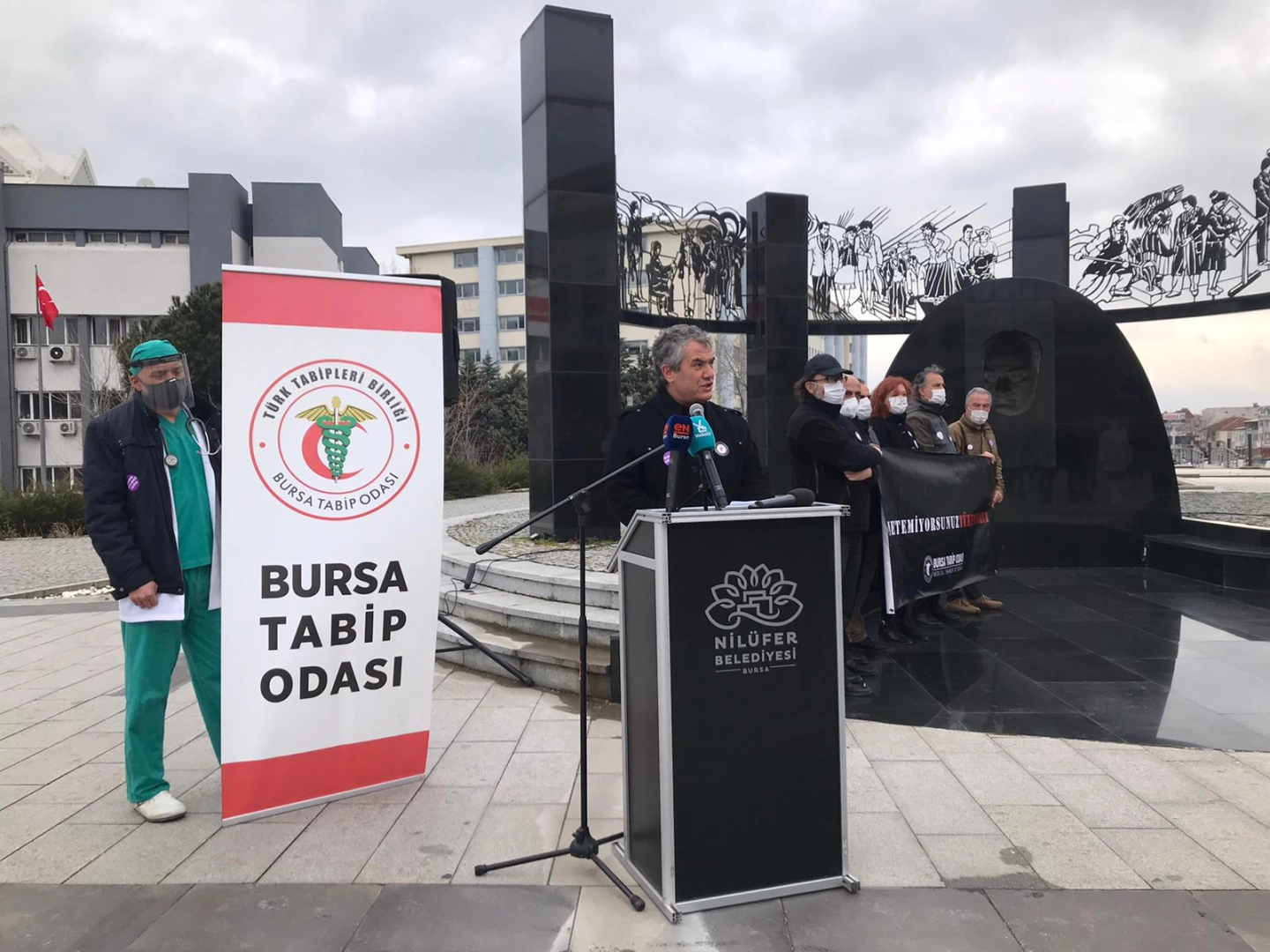 Bursa Tabip Odası tarafından Nilüfer Belediyesi Halkevi meydanında bulunan Atatürk Anıtı önünde “COVID-19 nedeniyle hayatını kaybeden hekim ve sağlık çalışanları” için basın açıklaması gerçekleştirdi. Açıklamayı Bursa Tabip Odası Başkanı Doç. Dr. Alpaslan Türkkan yaptı.