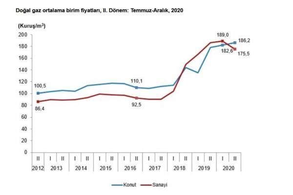 2020 yılının ikinci yarısında yıllık bazda, sanayi işletmelerinde kullanılan doğal gaz fiyatları ise yüzde 5,8 düşerken, aynı dönemde konutlarda kullanılan doğal gazın fiyatı 4,4 yükseldi.