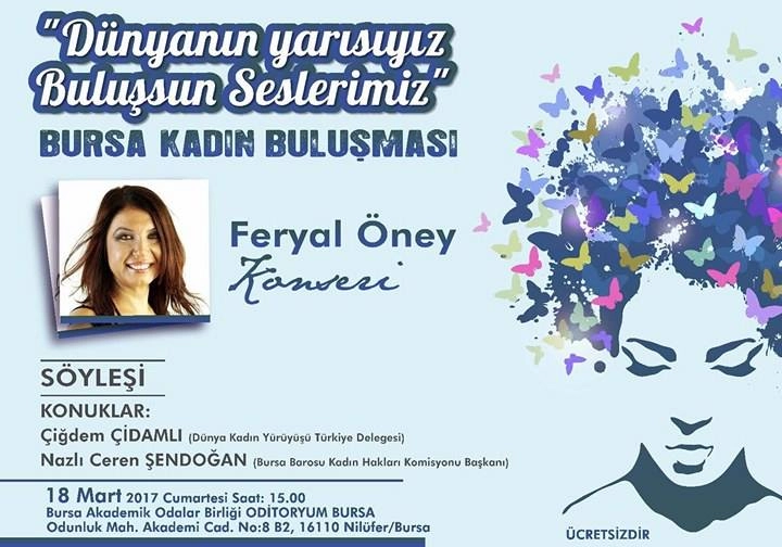 Bursa Akademik Odalar Birliği'nde 18 Mart Cumartesi günü saat: 15.00'te düzenlenecek olan etkinlik kapsamında Dünya Kadın Yürüyüşü Türkiye Delegesi Çiğdem Çidamlı ve Bursa Barosu Kadın Hakları Komisyonu Başkanı Nazlı Ceren Şendoğan bir söyleşi gerçekleştirecek.