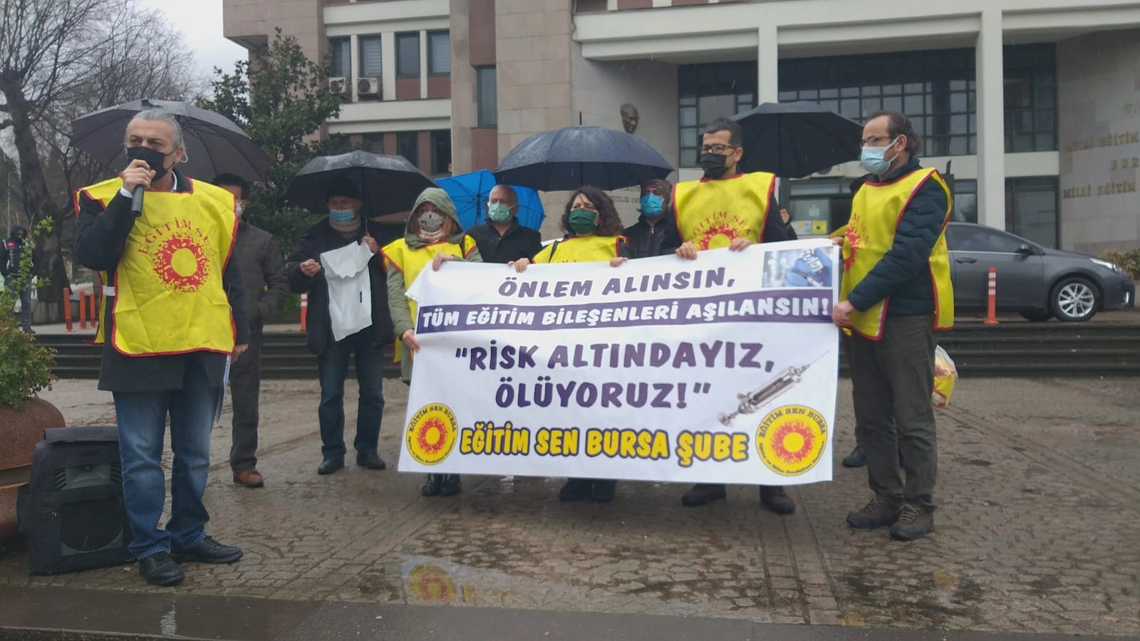 Okullardaki vaka artışları ve eğitim bileşenlerinin halen aşılanmamasını Eğitim Sen Bursa Şubesi İl Milli Eğitim Müdürlüğü önünde yaptığı basın açıklamasıyla protesto etti.