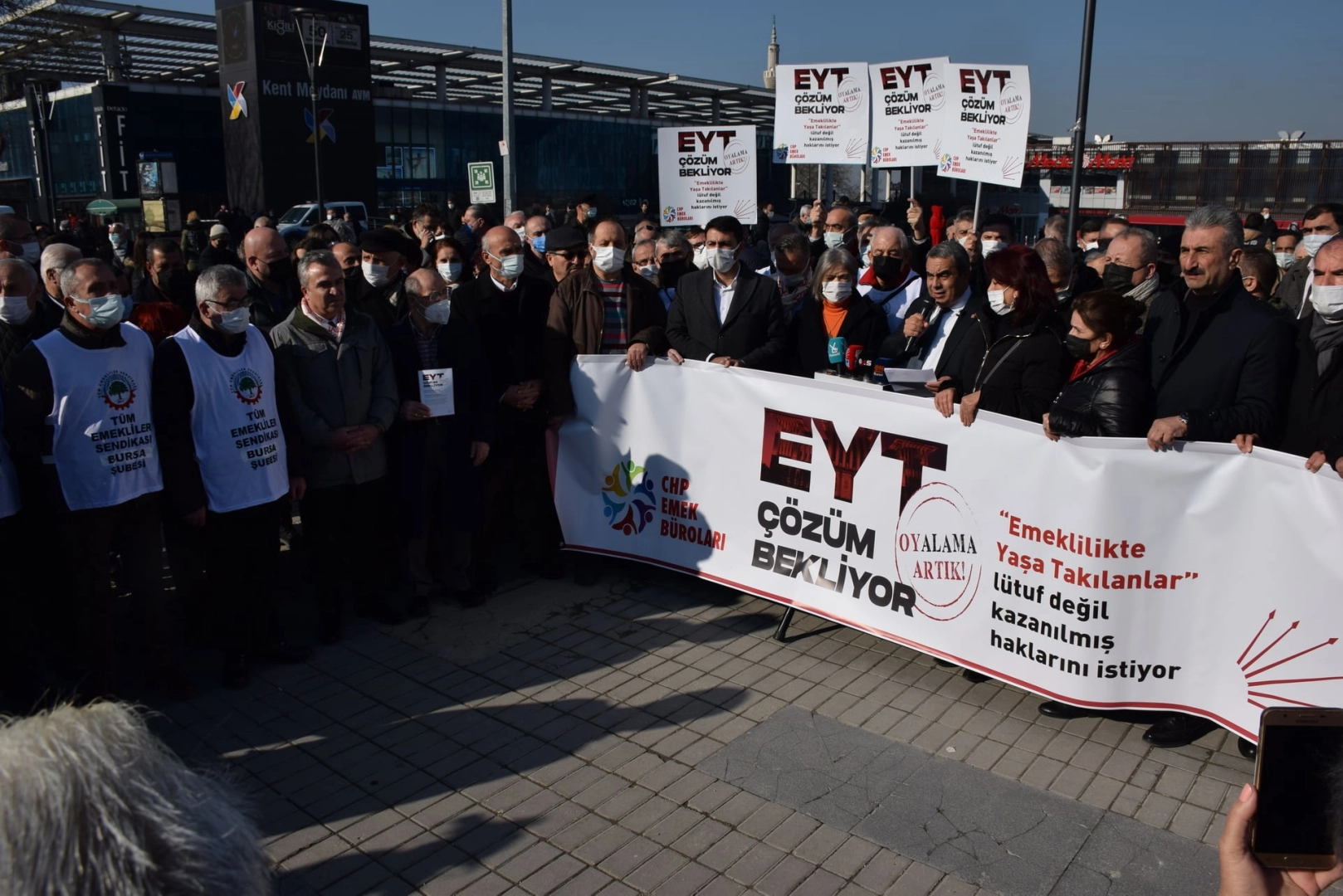 Bursa’da Cumhuriyet Halk Partisi, EYT’lilierin sorun ve taleplerini dile getirmek için emeklilerle birlikte Kent Meydanı’nda basın açıklaması gerçekleştirdi.