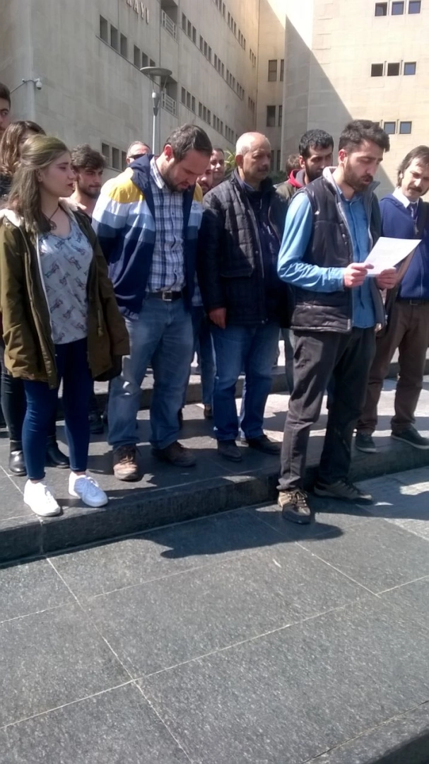 Gezi'nin Soma'nın katilleri değil, hesap soranlar yargılanıyor "Gezi'de onlarca insanın ölümüne sebep olan, emri ben verdim diyen, Soma’da yüzlerce madenci kardeşimizin ölümünden sorumlu olan, kamu düzenini sağlamak adına Kürt illerinde katliama yol açan, birçok yolsuzluk ve hukuksuzlukla anılan kendileri değilmiş gibi; bütün bunları gündem eden, hesap soran bizler yargılanıyoruz." diyen Baş, tüm baskılara, davalara rağmen dimdik ayakta olduklarını belirtti. Yargı sopasını kullanarak, baskı altına almaya çalışılan kurumlar ve temsilcilerinin bu ceza şantajına boyun eğmeyeceğini ifade eden Atakhan Baş, "Yıllardır özellikle bu adalet binalarının önünde haykırıyoruz. “Adalet herkese lazım olacak.” Bizleri bugün hukuk sopasıyla korkutmaya çalışanlar, işlerine gelmediğinde ben bu kararı tanımıyorum diyenler, elbette halkın adaletiyle karşılaşacaklardır." şeklinde konuştu. 7 kişinin tutuksuz yargılandığı dava Haziran ayına ertelendi.