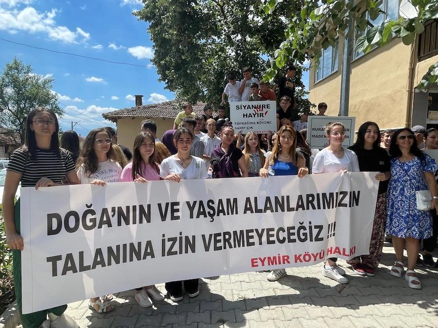 Bursa’nın İnegöl’e bağlı Eymir Köyü’ne kuş uçuşu yaklaşık 2 kilometre uzaklıkta Maden Tetkik ve Arama tarafından altın ve bakır madeni arama çalışmaları başlatıldı. Köylerine ait sulama göletinin hemen üst bölgesinde 15 ayrı lokasyonda 18 sondaj kuyusunun açıldığını ve 4 bin 500 metrekarelik alanda arama çalışmalarının yürütüldüğünü öğrenen Eymir Köyü halkı çalışmaların durdurulması için harekete geçti.