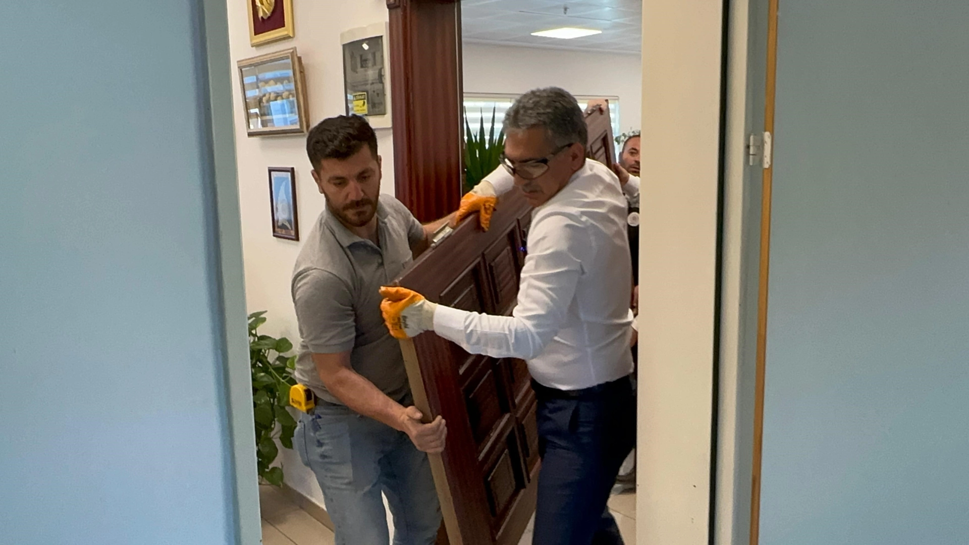 https://twitter.com/sukrudeviren/status/1775781279981580737Konuşmasının ardından iş güvenliğinin önemine de vurgu yapan Deviren, makam kapısını kendi elleriyle söktü.
