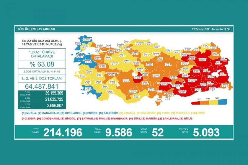 Sağlık Bakanlığı, Kovid-19 pandemisine ilişkin günlük resmi verileri açıkladı. Verilere göre, son 24 saate 9 bin 586 kişinin Kovid-19 testi pozitif çıktı, 52 kişi daha yaşamını yitirdi.