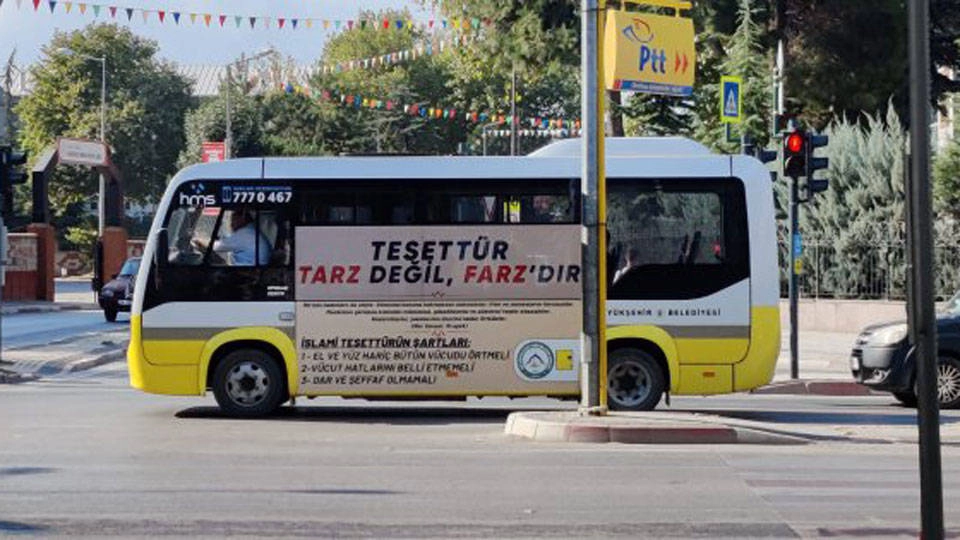 AKP iktidarının desteğiyle büyüyen gerici yapıların toplumu dinselleştirmeye dönük faaliyetleri sürüyor. Bu kez de halk otobüsleri aracılığıyla kadınlara nasıl giyineceklerine ilişkin “ders” verildi.