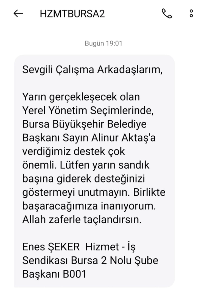 Hizmet-İş Sendikası Bursa 2 Nolu Şube Başkanı Enes Şeker işçilere AKP’nin Büyükşehir adayı Alinur Aktaş için oy isteyen mesaj attı.